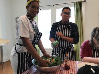 The first thing that we actually made was our snack, our snack was called “spinacotta”, it consisted of kale, feta, olive oil, and filo sheets. The original recipe actually called for spinach but our goal today was to use kale in three different ways. The process was pretty easy, we each either were given some kale or fetta to cut up, the kale was sauteed with some olive oil and garlic. Once we had all of our ingredients mixed we continued on with the actual process itself. We each were given a bowl of oil which was used as a type of glue, were all given about two sheets of filo dough at a time because they are really thin. Since they break apart when we fold them we had to put a good amount of oil on them. Next we put the filling in and started folding them into triangles, covering them in egg wash after so they would become a nice golden color. After we all finished we finally got to bake and eat them.